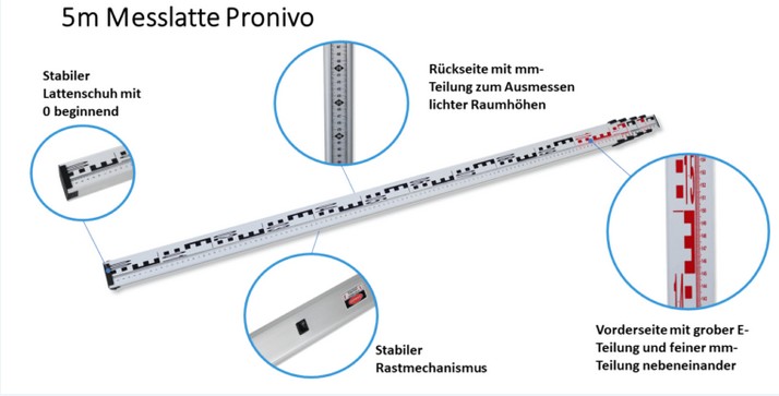 - Beidseitige Skalierung: Vorderseite mit grobe E-Teilung und feine mm-Teilung und auf der Rückseite eine mm-Teilung beginnend bei 0 – ideal zur Messung lichter Raumhöhen.